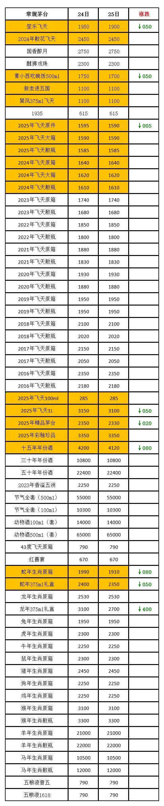 常规茅台中:2025年飞天原箱,飞天1L,精品茅台,十五年年份酒下跌。